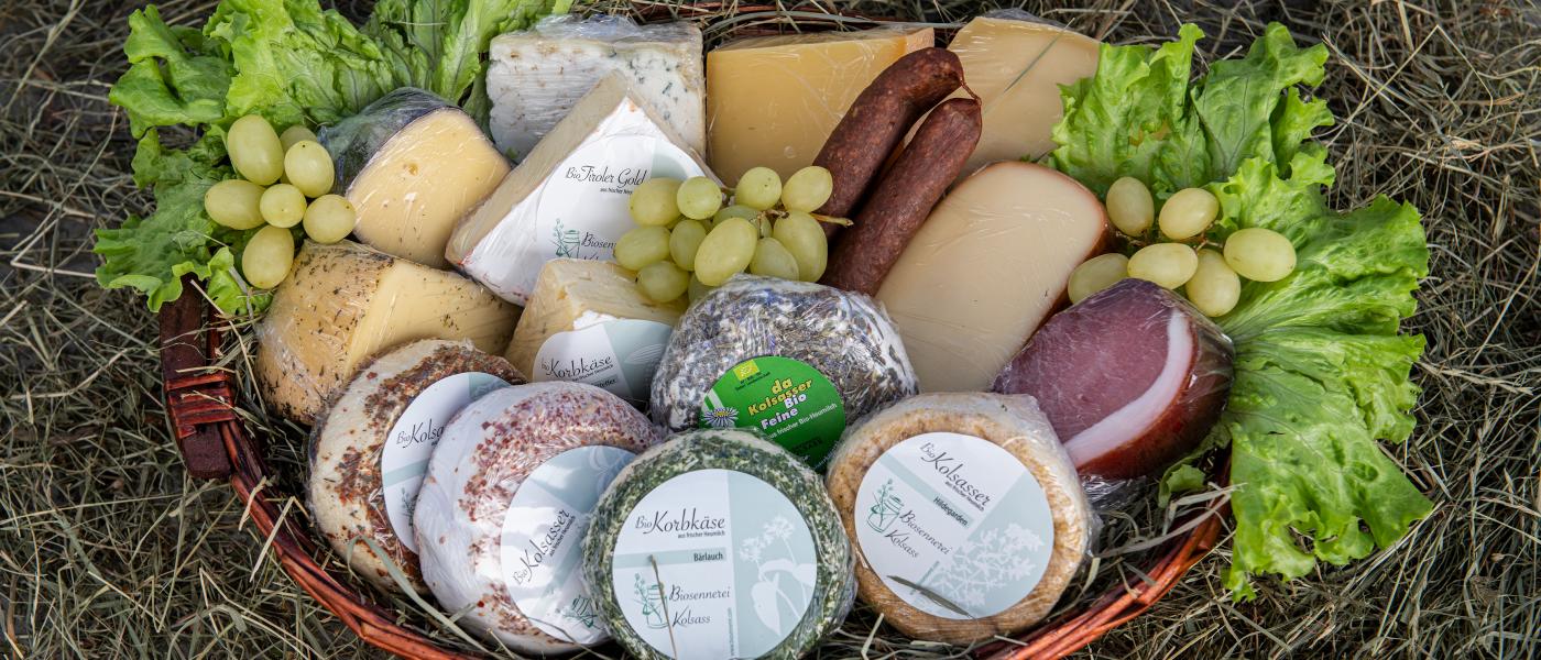 Bereite deinen Lieben eine Freude mit unseren individuell zusammengestellten Geschenkkörben. Du kannst aus unserem Sortiment feiner Käsesorten aus biologischer Heumilch eine Auswahl ganz nach dem Geschmack des/der Beschenkten auswählen - oder dich auf einfach selbst beschenken. Optional bieten wir dazu auch Speck und Wurst aus regionaler Produktion an. Wir stellen den Geschenkkorb in der gewünschten Größe und mit den von dir ausgesuchten Produkten jederzeit gerne auf Vorbestellung zusammen. Er eignet sich auch perfekt als Aufmerksamkeit für deine Mitarbeiter.